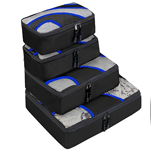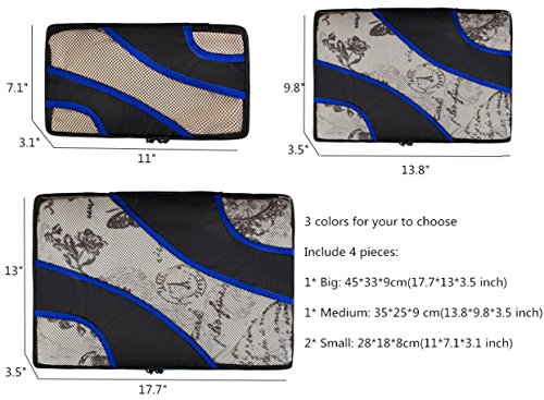 Product Description Butmoon Luggage Packing Travel Organizers?4 Set Packing Cubes Dimensions: -- 1 * Large ( 17.7" x 13" x 3") -- 1 * Medium (13.75" x 9.8" x 2.8") -- 2 * Small (11" x 7" x 3") Please allow the chromatic aberration and dimension error packing for a trip is fitting everything you want to bring with you into your luggage. Different size packing cubes can separate your different things to save your clothes from stains, wrinkles and damages. They will make your luggage looks neat and compact and easy to find everything you put.