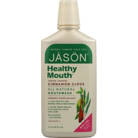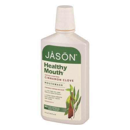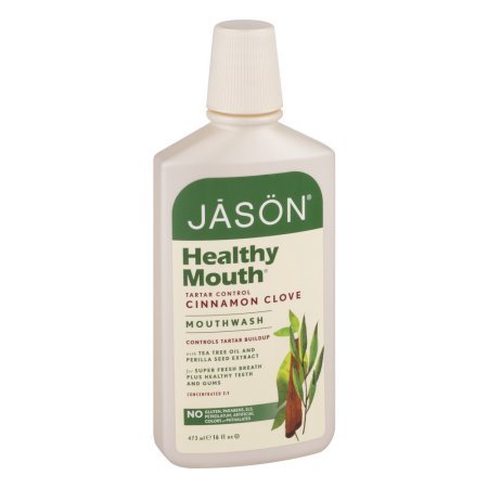 -. Feature : Jason Healthy Mouth Mouthwash Tartar Control Cinnamon Clove. / With Tea Tree Oil And Perilla Seed Extract. / Controls Tartar Buildup. / For Super Fresh Breath Plus Healthy Teeth And Gums. / No Gluten, No Parabens, No SLS, No Petrolatum, No Artificial Colors or Phthalates.