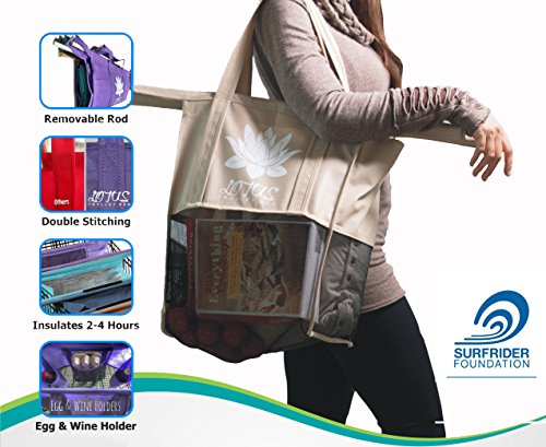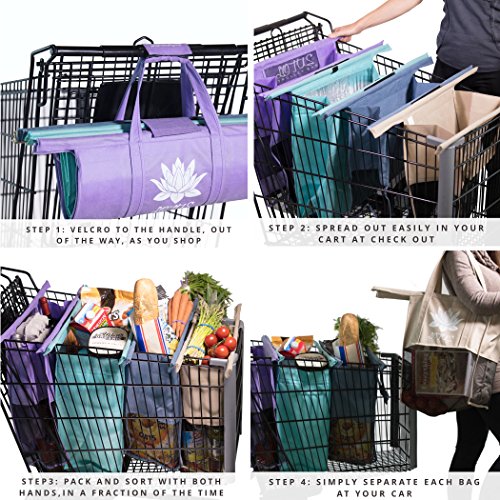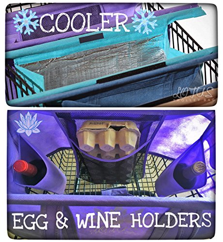 We would like to introduce: Lotus Trolley Bags - a new Patent Pending design to help organize and pack your groceries in a fraction of the time. Be prepared for the jealous eye from people while you shop. Help the environment and look good doing it. Show all of your neighbors that you care. Be organized while you shop while others just have a big mess in their carts. NO QUESTIONS ASKED GUARANTEE POLICY HOW DOES IT WORK Our unique Velcro handle allows you to hang the bags onto the back of ANY shopping cart. No hook needed. Then shop as normal. When all your items are on the conveyor belt, simply place the bags inside the cart and spread them out in one easy motion. You now have 4 open, upright bags allowing you to pack your goods with both hands in a fraction of the time. At your car, effortlessly separate each bag to individually fit in your trunk. Once unpacked simply reattach the bags along the Velcro strips and roll up. Make your grocery shopping effortless! UNIQUE FEATURES • Innovative Patent Pending design with Egg and Wine Holder. • Washable, eco-friendly, non-woven fabric with durable double stitching. • Strong wide handles that can strap over your shoulder. • The LARGE INSULATED Bag features thermal insulation to keep items cold or hot for hours. It is a must have for meats, pizzas, cold cuts, dairy, perishables, and frozen foods. • Durable, sturdy and mildew and mold resistant. • Eliminate earth damaging and animal hurting plastic bags and tree killing paper bags. • Avoid all of the cheap knock offs and low end copies. • Tested by the factory to handle up to 70lbs (32kg) • THE ULTIMATE REUSABLE GROCERY BAG SET. Designed to last! • Using only the Best Quality Materials and made to the HIGHEST STANDARDS of manufacturingFeature