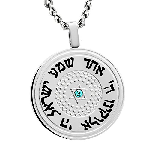 -. Feature : Stainless Steel Pendant Necklace Shema Israel - Sh'Ma Prayer Pendant Necklace / Pendant Diameter 1 1/4 Inches = 30 mm / 3mm CZ Blue Lucky Stone Inside the David Star Engraved / Shema Israel Pray Engraved in Black all around the Pendant / Cuban Curb Link Chain Necklace. Choice Lengths 18" 20" 24" 28"