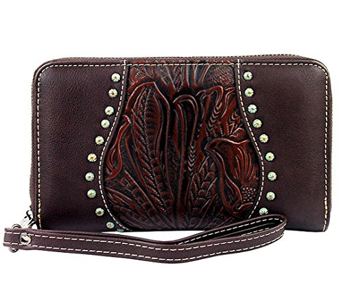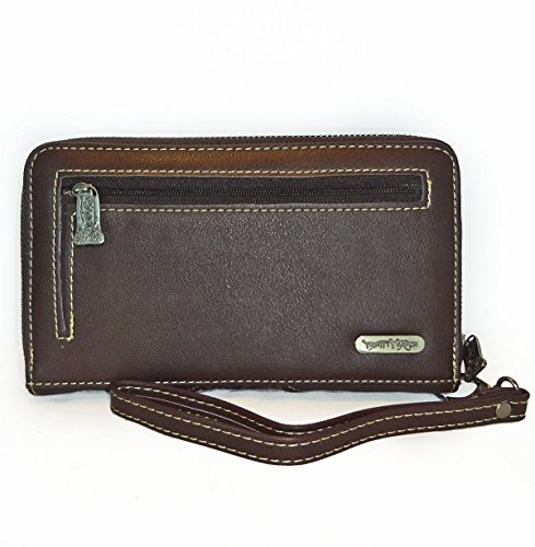 Studio : Western Fashion Publisher : Western Fashion Binding : Apparel Product Description New Trinity Ranch® Tooled Leather Wristlet Wallet w/ Patina Studs- CoffeeProduct Code: TR23-W002 Wallet Details: Length: 7.5 Height: 4 Depth: 1 Wristlet Strap 7 Floral and leaf tooled pattern on the genuine leather, Pu Leather Trim Backing (PU leather: leather particles coated in Polyurethane or a thin layer of leather coated in Polyurethane) - Embellished with Patina studs, green effect - Zipper pocket on Back, Trinity Ranch Name Plate - Removable, Wristlet Strap Inside: - 5 Bill Pockets, Zipper Pocket, 8 Card Slots 0