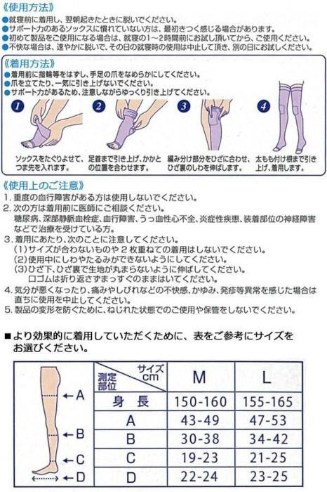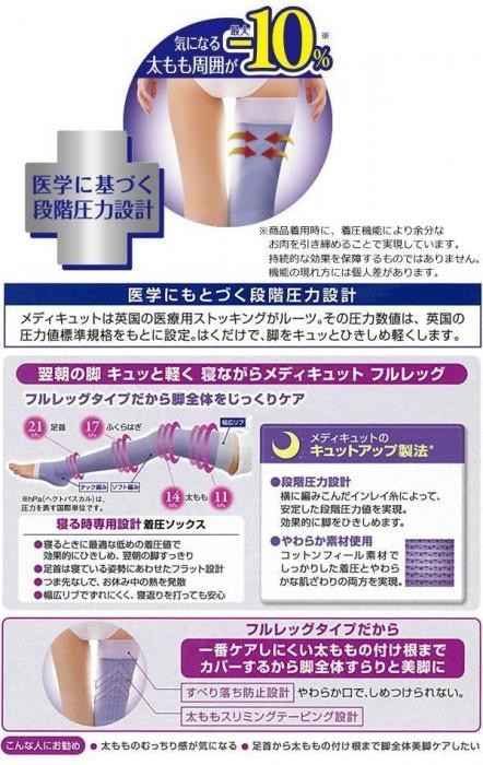 履くだけで脚をキュッと引き締める着圧ソックスです。寝るときに最適な低めの着圧値で効果的に引き締め、翌朝の脚すっきり♪フルレッグタイプなので脚全体をじっくりケアし、つま先なしでお休み中の熱を発散します。足首は寝ている姿勢に合わせたフラット設計。幅広リブでずれにくく、寝返りを打っても安心です。 |