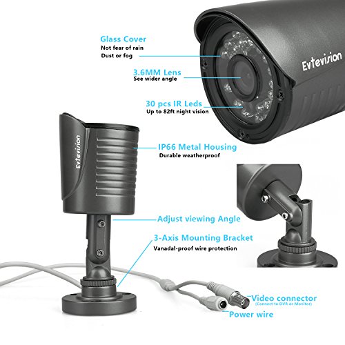 Evtevision 1/3" CMOS 1200TVL CCTV Home Surveillance Weatherproof 30 Led 3.6mm Lens Wide Angle Bullet Security Camera with IR Cut-85ft IR Night Vision Distance, Metal Housing Grey