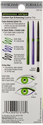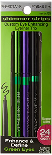 Physicians Formula shimmer enhancing eyeliner color: Green eyes the perfect set of three eyeliners to enhance your green eye color and provide glamorous definition. Long-wearing, water-resistant and smudge-resistant formula for 24-hour wear. Enhance and define, layer shades together for endless looks, hypoallergenic, fragrance free, paraben free, dermatologist approved, safe for sensitive eyes and contact lens wearers.Feature