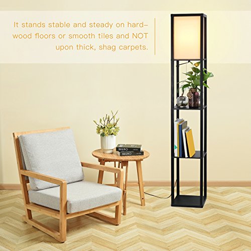 - STABLE & STEADY: Due to the lightweight design of this floor lamp, it stands stable and steady on hardwood floors or smooth tiles and NOT upon thick, shag carpets. Assembly takes approximately half an hour and requires a screwdriver. Shelves are not adjustable in height.