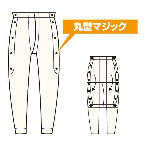脱いだり着たりの、毎日の動作が簡単にできるよう、ボタンやデザインにしっかり工夫を凝らしています。手術後や介護が必要な方、手足の不自由な方に、お年寄りに。ボタンをかける手間をなくした、「丸型マジック式ボタン」。腹部治療中の方に。脱がずに包帯やおむつの取り替えが簡単!