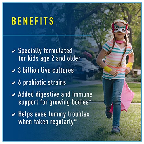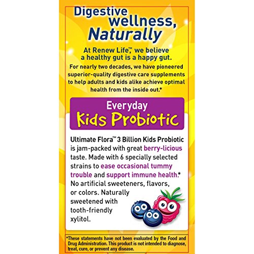 Keep your child's tummy in tip-top spirits every day with Ultimate Flora Kids Probiotic 3 Billion. This daily chewable probiotic is made with 6 scientifically studied Lactobacillusand Bifidobacterium strains to ease occasional tummy trouble and support digestive and immune health. Each tablet is bursting with delicious Berry-licious taste, and is naturally sweetened with tooth-friendly xylitol with no artificial sweeteners, flavors, or colors. These statements have not been evaluated by the Food and Drug Administration. This product is not intended to diagnose, treat, cure, or prevent any disease. * These statements have not been evaluated by the Food and Drug Administration. This product is not intended to diagnose, treat, cure, or prevent any disease.Feature
