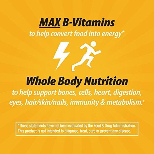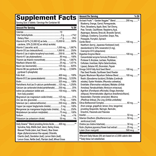 It's also packed with high potency B-vitamins to help convert food into energy*, Orchard Fruits/ Garden Veggies powder blend (200 mg per serving), and nutrients to help support bone health, daily energy, eye health, heart health, and immune health