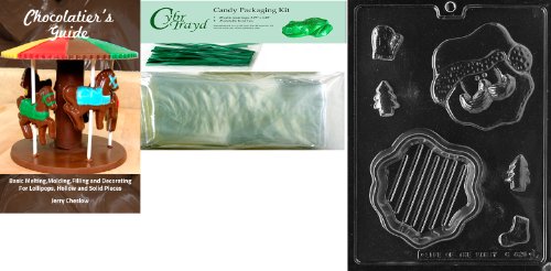 Cybrtrayd Santa Face Pour Chocolate Mold with Chocolatier's Bundle of 25 Cello Bags, 25 Green Twist Ties and Chocolatier's Guide
