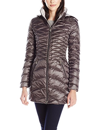Packable down coat in metallic shimmer featuring cinched waist with crossing quilted pattern Removable hood Includes packable drawstring bag Brand : Laundry by Shelli Segal Item model num : Packable Down Jacket With Hood EAN : 0700770286566 Product Dimensions(LxWxH) :