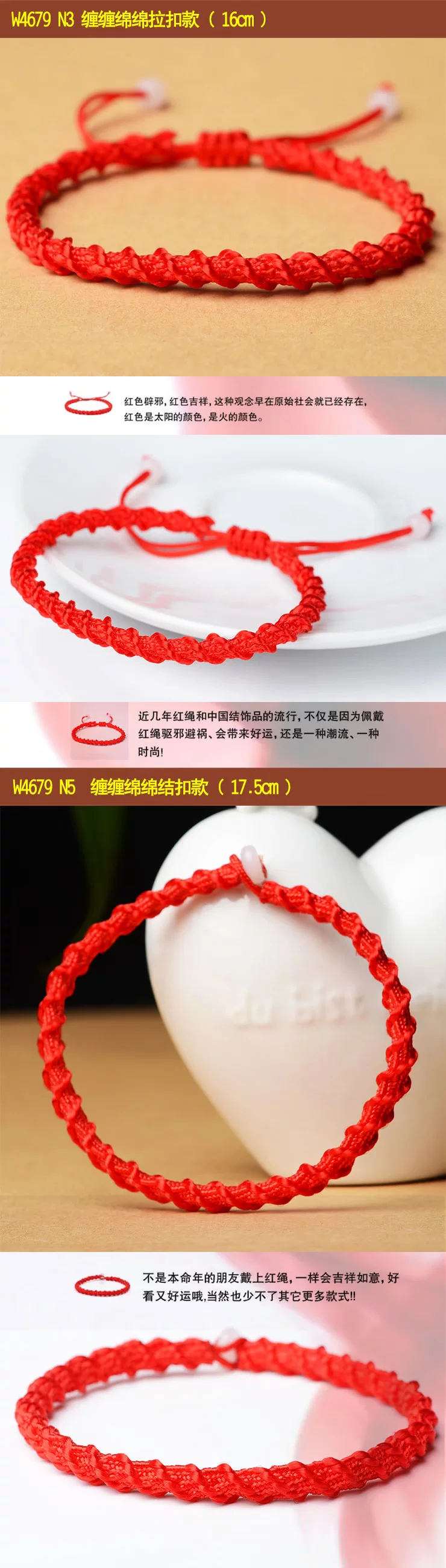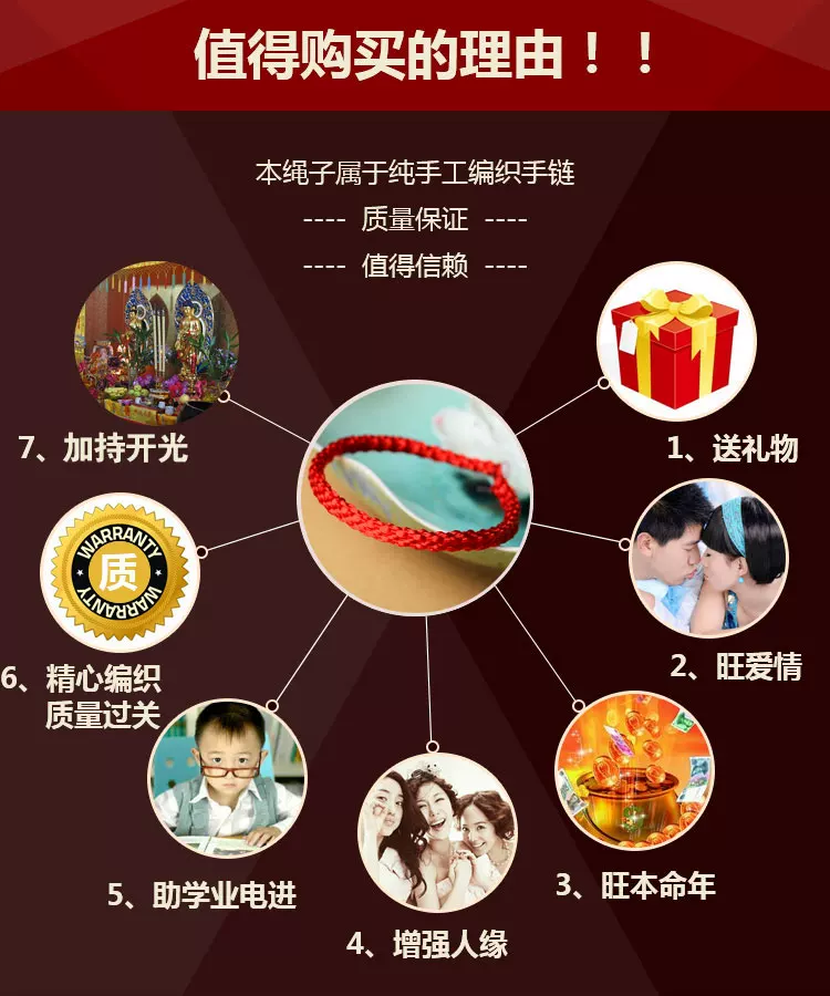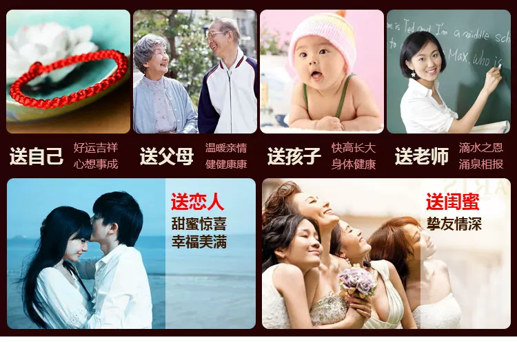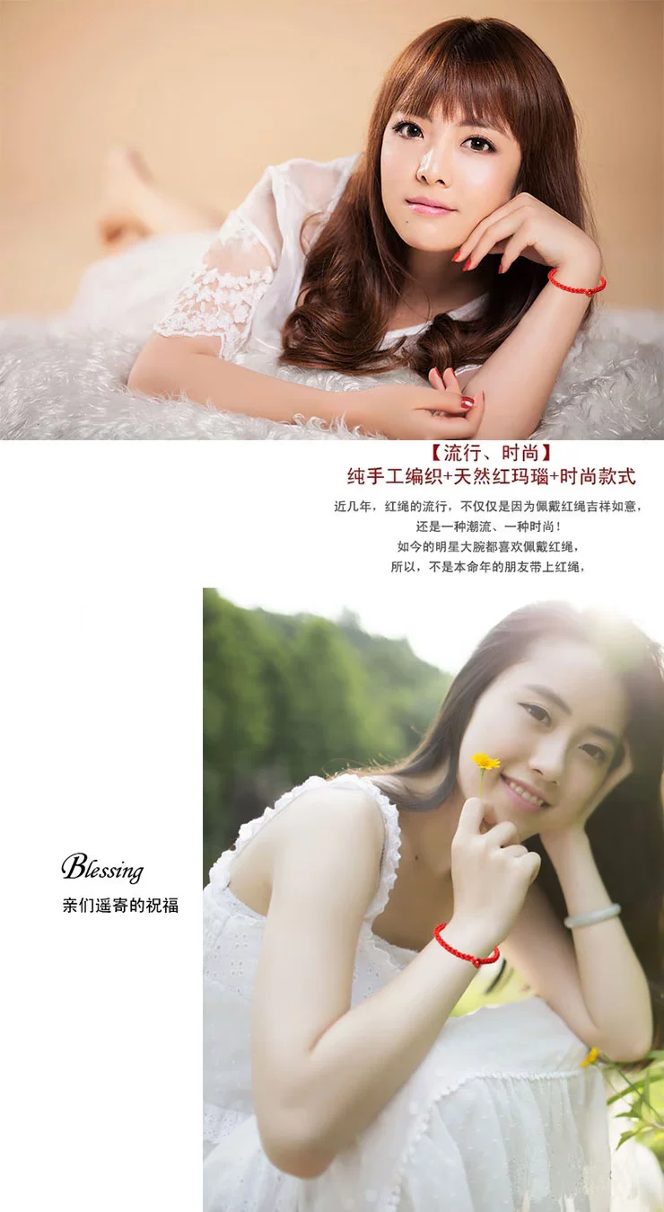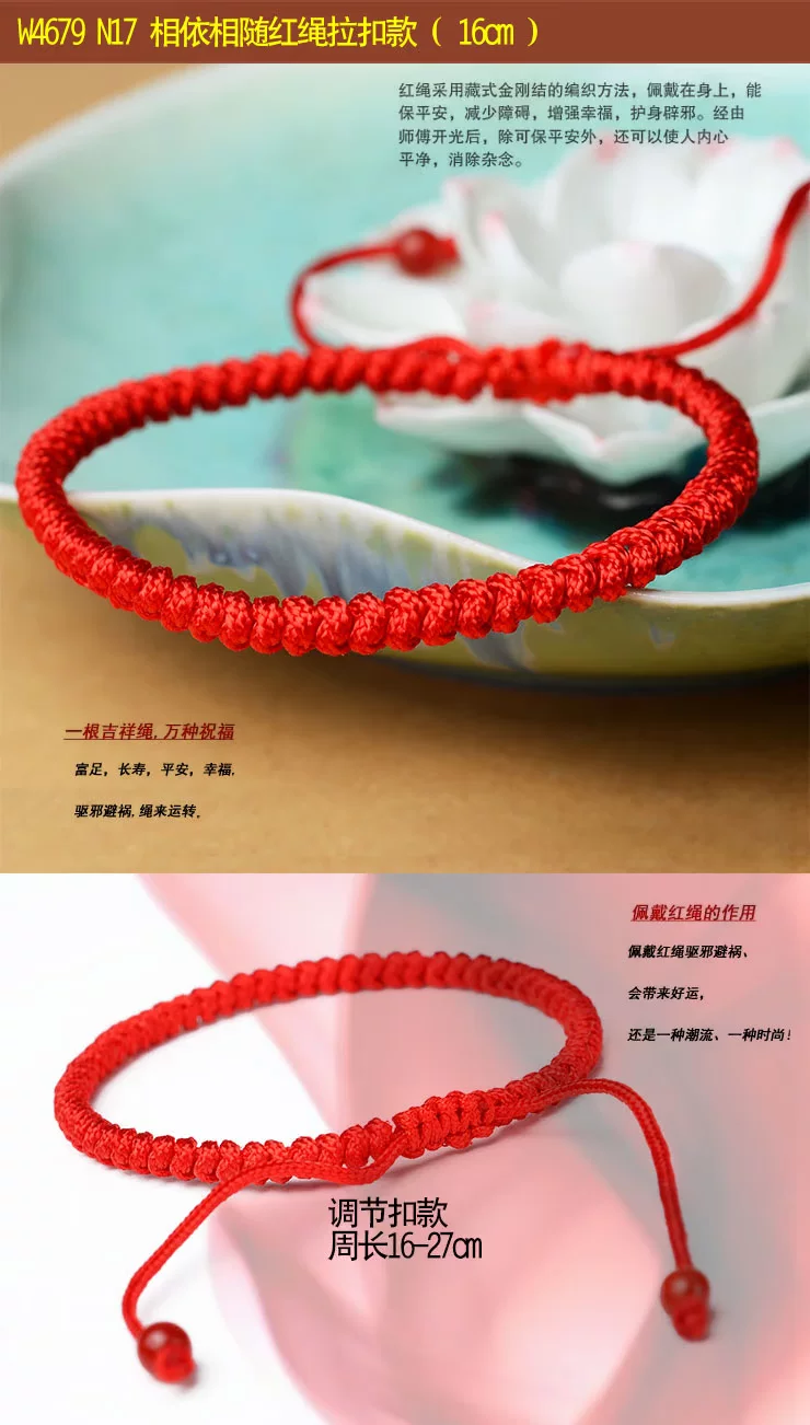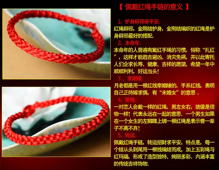 What is the lucky meaning of red? This concept has existed as early as the red evil spirits in the primitive society, red is the color of the sun, is the color of fire. Along with the changes of the times, it is thought the red has not changed: New Year paste red couplets; Han old style wedding in the wedding once, red scarf, red candle; St gongbang, regardless of when and where, people have to use red to add festive, so red has been regarded as Xi Qing, success, a symbol of loyalty and justice, especially in the exorcism supporter has special function. "This animal year" [introduction] In the traditional custom, this animal year is often considered an unlucky year. "This animal year guilty of Jupiter, Jupiter pledge to sit, there will be no joy and woe" ballad is about the best portrayal of this animal year less auspicious. So people put "life" is called the "threshold", meaning: a year spent as threshold children. Regardless of adults and children, in Natal to red rope, commonly known as "red tie, the children would also like to wear red waistcoat and red pants, think to good lucks, avoid disasters, and this sustenance of people Qiqiu longevity, healthy, safe, the auspicious wishes. This year starting from the first day, the red string is generally not taken until the arrival of the new year, a year. [a] Xiangsheng Kyrgyzstan, 000 blessing A few feet long red rope after coiling the dexterous hand, knot, wear, winding, weaving, such as smoking various process skills, instantly turned into a consistent, left and right symmetry, the same positive and negative, head and tail can be connected to each other to form a complete, is the symbol of the hold hand of the child, and son Xielao pad long knots; on behalf of the whole life happiness, peace knot of peace; meaning every year wealth, auspicious superabundant fish node... In the words of the ancient poet, had recorded: "cross wire junction Longfeng, Lou Cai Yunxia weaving, one inch concentric strand, Millennium long-lived flowers." The full expression of the beautiful meaning of Chinese culture, red rope, each flower node are entrusted with the good wishes of the Chinese people for thousands of years the same: wealth, longevity, peace, happiness, Evil Refuge, rope to run. It is no longer an ordinary red rope, nor is it merely a decoration, but a magic sacred blessing. In recent years, the red rope popular, not only because of wearing the red rope exorcism avoid misfortune, will bring good luck, or a trend, a fashion! My friend is not so as to put on a red rope, good luck, good and good luck! Send a mother to wish her happy! Health and longevity! Send a root to someone you love, wish her (him) good luck! Good luck life! Send a root to the people who love you, wish her (he) succeses! Dream come true! Send one to oneself ---- I wish myself a happy life! Everything goes well! Send one to the child --- I wish him (her) healthy and lively! Safe growth [red] it will rope sansei sansei stone river, every 500 years to grow a root "...... In the 1500 years to pick to 3 root, made into a rival rope, to both wear on them that the love of people, hand in hand for all eternity. Together... Explanation of rope series three shares: Buddhism: three refers to the Buddha, the law, the monk Marriage: three signifying love life I Ching: life two, two students in three, three things! The red rope accessories, such as the red string necklace, bracelet, anklet red red rope rope, red rope chain etc.. Red is a Book of gossip in the "diagram", represents the light, five line of fire. According to the theory of yin and Yang Yang is red, like the sun, where the dark evil consumed. From the viewpoint of numerology theory, "Benming year" are all negative number, by adjust the red mildew is one of the simple and easy method. In addition, the red rope in ancient times is regarded as a kind of evil. Red rope meaning "The Jin Shi, Li Zhi 9": "Stanford forgiveness instrument, design holding of the wood crane a celestial being, to red rope penetration, lead to tackle, in Royal before Bannister." Yuan song "spring" no poem: "Jin Yan Feng dark dust string, red string wind tight swing club." Red marriage "Three - money scholar Chou": "wrong for Phoenix does not have to hire a daughter jade pestle, wrapped around the Hongsheng biped." Sichuan Opera, "Tan Ji Er" first: "what to say gossip, non slave Shouzhi not firm, Xiang Shunv Zhuo's Wenjun, Ben Sima story early spread. Zennai and red rope has been cut by water, leaves did not return." Declaration of love A symbol of love: a pair of lovers will wear the same, male, female right left, like a token! Called the chain of love "Lovelace" forever together.. If a boy in a girl's left ankle is tied to a red rope is said a lifetime buchibuqi!!! Very romantic, right. (if girl left-handed red rope, the delegation wanted to increase the Yixing Yuan; right-handed red rope's words represent hope their peace, healthy) Faye Wong began many years ago wearing the red hand rope, Faye Wong Buddhist belief, hand wear the 'red line' called rope of blessing, is the Buddhist society the most honourable of soba, Ningbo car (lamazoparinpoche) read the protective red rope. Wear in addition to insurable peace outside, can also is Nei Xinping static and purification of distractions. Of course, we must have faith in the people wear Shangcai helpful, and Faye Wong will is for security and peace. Her friend, like Carina Lau together wearing. Then later, see Yao Ming and Rosamund Kwan have to wear. Now in the Chinese male gymnastics team, found that they all wear, wearing red rope will bring good luck peace, but also China's cultural products for thousands of years. The red rope role a lot, there are praying for marriage, also have strong love, and ensure the safety of transport...... Are people