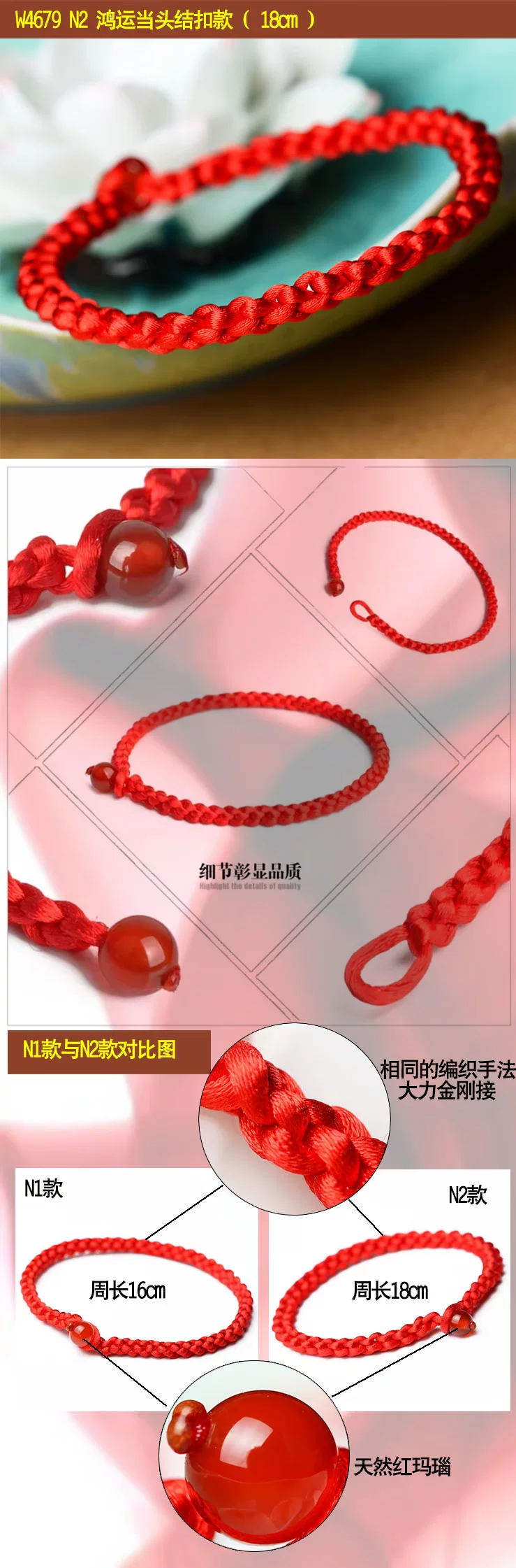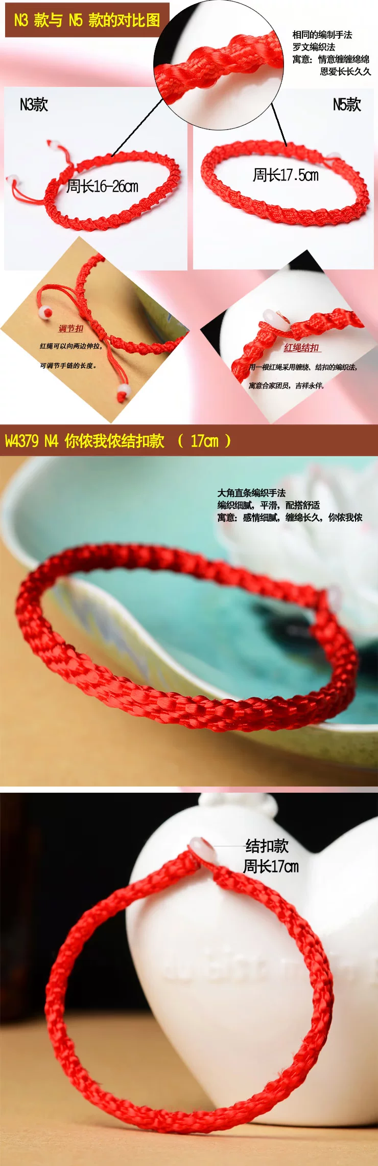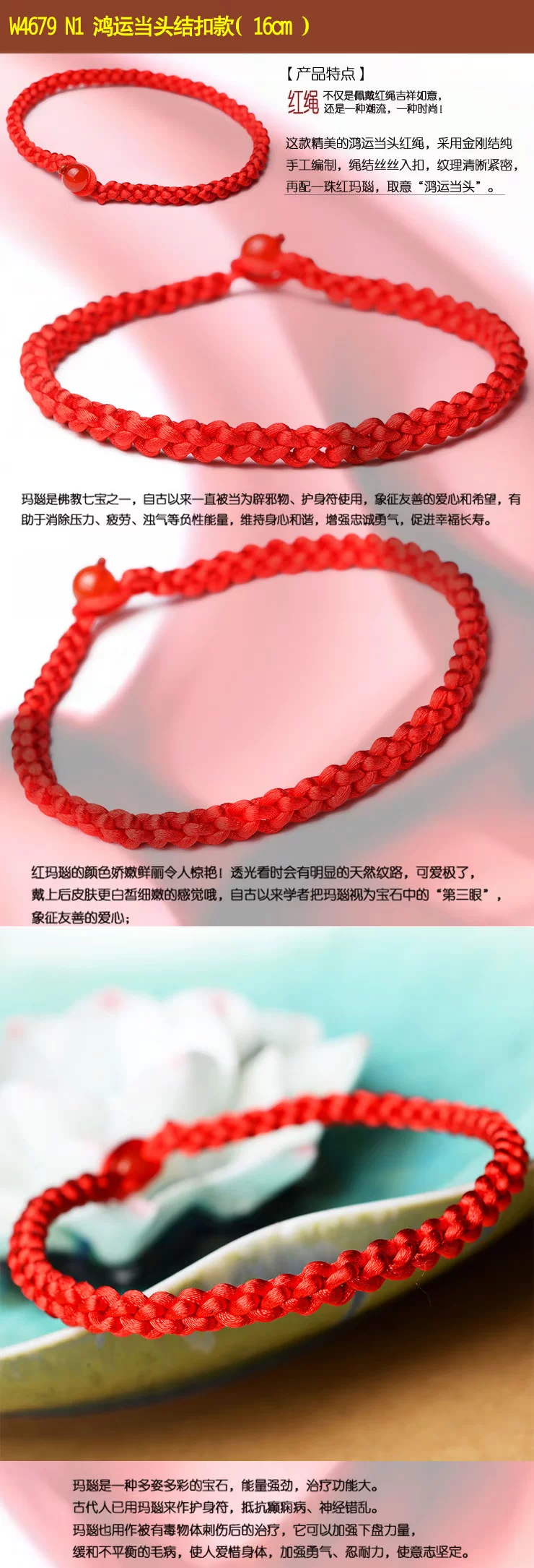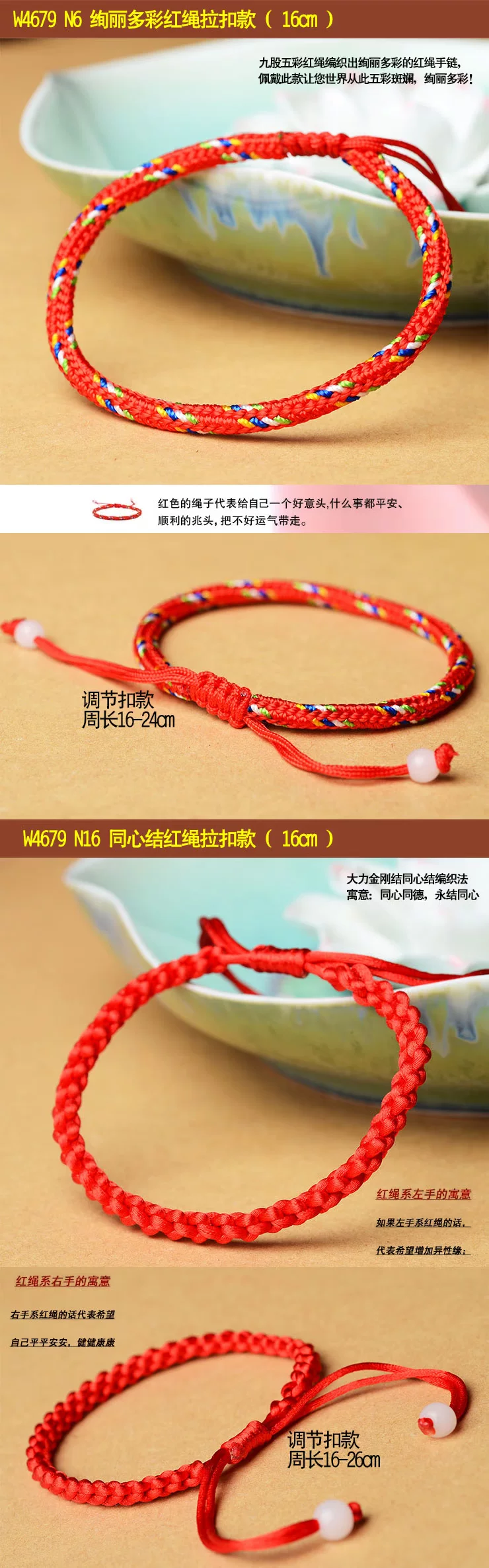 What is the lucky meaning of red? This concept has existed as early as the red evil spirits in the primitive society, red is the color of the sun, is the color of fire. Along with the changes of the times, it is thought the red has not changed: New Year paste red couplets; Han old style wedding in the wedding once, red scarf, red candle; St gongbang, regardless of when and where, people have to use red to add festive, so red has been regarded as Xi Qing, success, a symbol of loyalty and justice, especially in the exorcism supporter has special function. "This animal year" [introduction] In the traditional custom, this animal year is often considered an unlucky year. "This animal year guilty of Jupiter, Jupiter pledge to sit, there will be no joy and woe" ballad is about the best portrayal of this animal year less auspicious. So people put "life" is called the "threshold", meaning: a year spent as threshold children. Regardless of adults and children, in Natal to red rope, commonly known as "red tie, the children would also like to wear red waistcoat and red pants, think to good lucks, avoid disasters, and this sustenance of people Qiqiu longevity, healthy, safe, the auspicious wishes. This year starting from the first day, the red string is generally not taken until the arrival of the new year, a year. [a] Xiangsheng Kyrgyzstan, 000 blessing A few feet long red rope after coiling the dexterous hand, knot, wear, winding, weaving, such as smoking various process skills, instantly turned into a consistent, left and right symmetry, the same positive and negative, head and tail can be connected to each other to form a complete, is the symbol of the hold hand of the child, and son Xielao pad long knots; on behalf of the whole life happiness, peace knot of peace; meaning every year wealth, auspicious superabundant fish node... In the words of the ancient poet, had recorded: "cross wire junction Longfeng, Lou Cai Yunxia weaving, one inch concentric strand, Millennium long-lived flowers." The full expression of the beautiful meaning of Chinese culture, red rope, each flower node are entrusted with the good wishes of the Chinese people for thousands of years the same: wealth, longevity, peace, happiness, Evil Refuge, rope to run. It is no longer an ordinary red rope, nor is it merely a decoration, but a magic sacred blessing. In recent years, the red rope popular, not only because of wearing the red rope exorcism avoid misfortune, will bring good luck, or a trend, a fashion! My friend is not so as to put on a red rope, good luck, good and good luck! Send a mother to wish her happy! Health and longevity! Send a root to someone you love, wish her (him) good luck! Good luck life! Send a root to the people who love you, wish her (he) succeses! Dream come true! Send one to oneself ---- I wish myself a happy life! Everything goes well! Send one to the child --- I wish him (her) healthy and lively! Safe growth [red] it will rope sansei sansei stone river, every 500 years to grow a root "...... In the 1500 years to pick to 3 root, made into a rival rope, to both wear on them that the love of people, hand in hand for all eternity. Together... Explanation of rope series three shares: Buddhism: three refers to the Buddha, the law, the monk Marriage: three signifying love life I Ching: life two, two students in three, three things! The red rope accessories, such as the red string necklace, bracelet, anklet red red rope rope, red rope chain etc.. Red is a Book of gossip in the "diagram", represents the light, five line of fire. According to the theory of yin and Yang Yang is red, like the sun, where the dark evil consumed. From the viewpoint of numerology theory, "Benming year" are all negative number, by adjust the red mildew is one of the simple and easy method. In addition, the red rope in ancient times is regarded as a kind of evil. Red rope meaning "The Jin Shi, Li Zhi 9": "Stanford forgiveness instrument, design holding of the wood crane a celestial being, to red rope penetration, lead to tackle, in Royal before Bannister." Yuan song "spring" no poem: "Jin Yan Feng dark dust string, red string wind tight swing club." Red marriage "Three - money scholar Chou": "wrong for Phoenix does not have to hire a daughter jade pestle, wrapped around the Hongsheng biped." Sichuan Opera, "Tan Ji Er" first: "what to say gossip, non slave Shouzhi not firm, Xiang Shunv Zhuo's Wenjun, Ben Sima story early spread. Zennai and red rope has been cut by water, leaves did not return." Declaration of love A symbol of love: a pair of lovers will wear the same, male, female right left, like a token! Called the chain of love "Lovelace" forever together.. If a boy in a girl's left ankle is tied to a red rope is said a lifetime buchibuqi!!! Very romantic, right. (if girl left-handed red rope, the delegation wanted to increase the Yixing Yuan; right-handed red rope's words represent hope their peace, healthy) Faye Wong began many years ago wearing the red hand rope, Faye Wong Buddhist belief, hand wear the 'red line' called rope of blessing, is the Buddhist society the most honourable of soba, Ningbo car (lamazoparinpoche) read the protective red rope. Wear in addition to insurable peace outside, can also is Nei Xinping static and purification of distractions. Of course, we must have faith in the people wear Shangcai helpful, and Faye Wong will is for security and peace. Her friend, like Carina Lau together wearing. Then later, see Yao Ming and Rosamund Kwan have to wear. Now in the Chinese male gymnastics team, found that they all wear, wearing red rope will bring good luck peace, but also China's cultural products for thousands of years. The red rope role a lot, there are praying for marriage, also have strong love, and ensure the safety of transport...... Are people