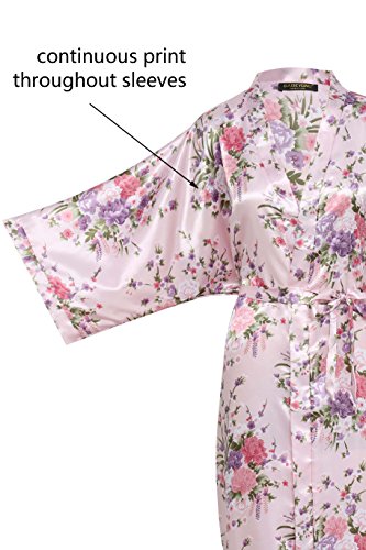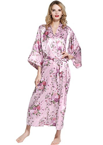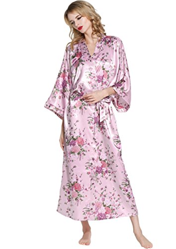 BABEYOND Womens Kimono Robe Long Floral Wedding Robes for Bridesmaids Satin Silk Kimono Nightgown Sleepwear 135cm Long (Pink)