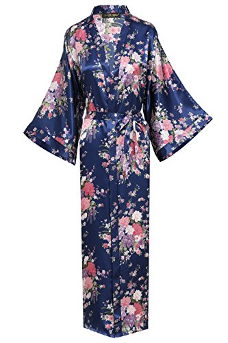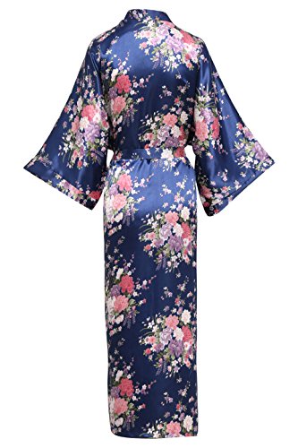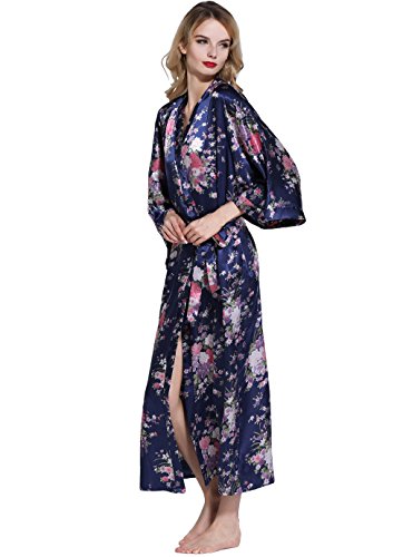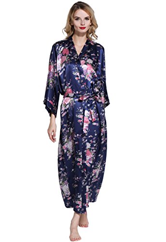 BABEYOND Womens Kimono Robe Long Floral Wedding Robes for Bridesmaids Satin Silk Kimono Nightgown Sleepwear 135cm Long (Blue)