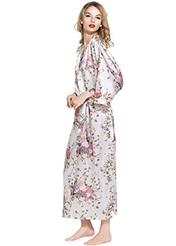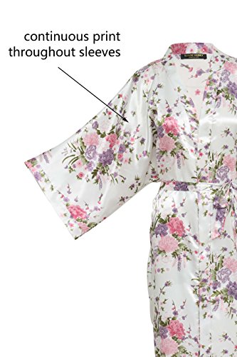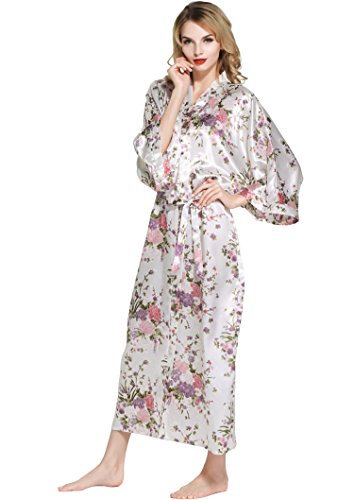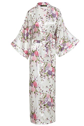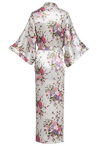 BABEYOND Womens Kimono Robe Long Floral Wedding Robes for Bridesmaids Satin Silk Kimono Nightgown Sleepwear 135cm Long (White)