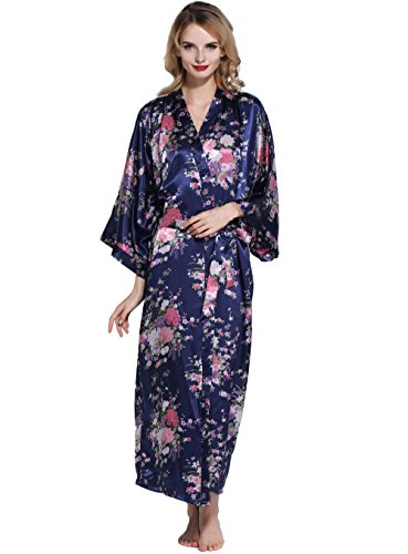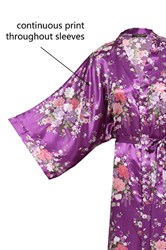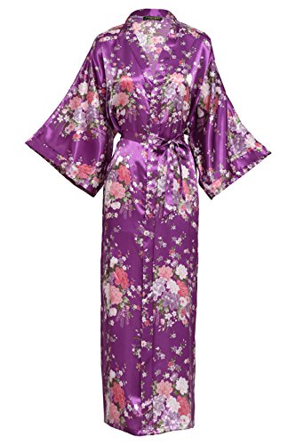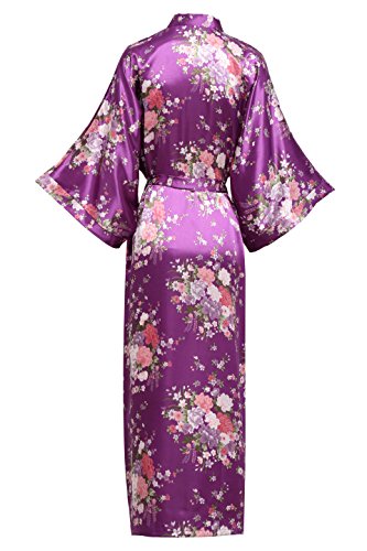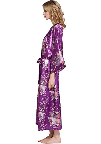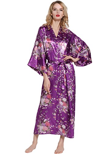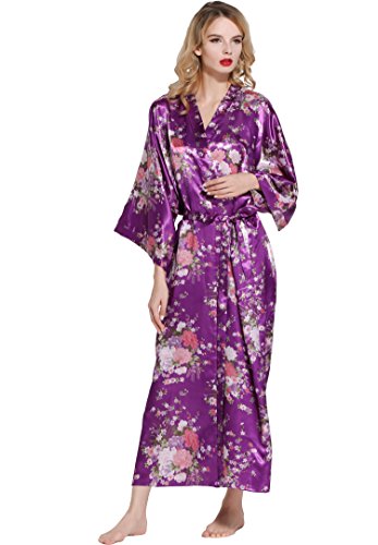 BABEYOND Womens Kimono Robe Long Floral Wedding Robes for Bridesmaids Satin Silk Kimono Nightgown Sleepwear 135cm Long (Dark Purple), One Size Fits Most
