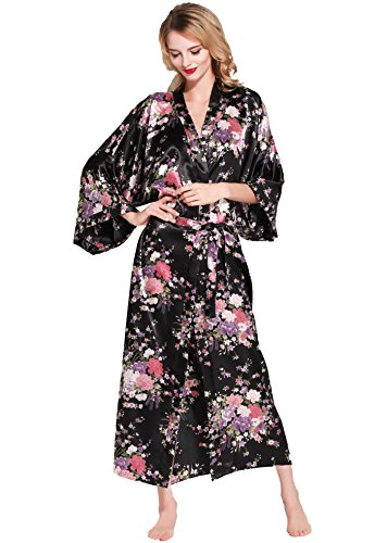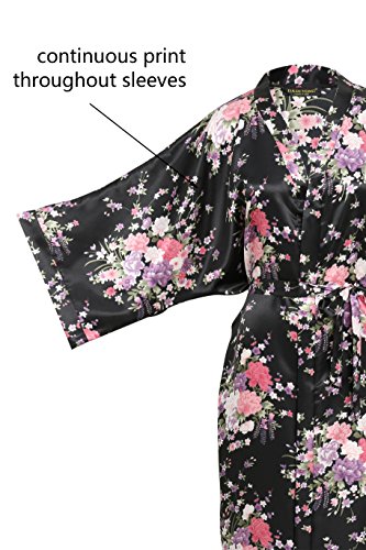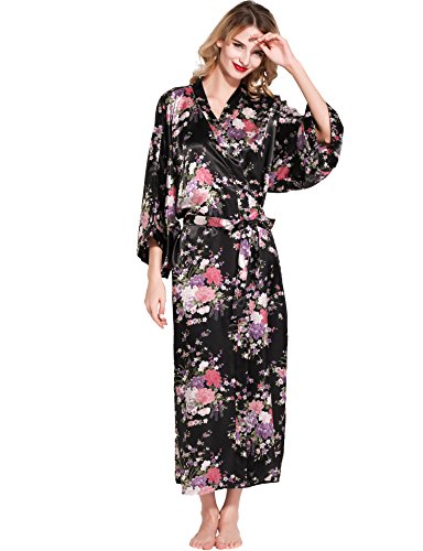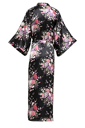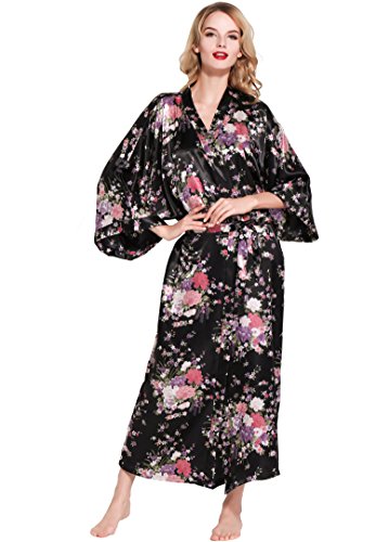 BABEYOND Womens Kimono Robe Long Floral Wedding Robes for Bridesmaids Satin Silk Kimono Nightgown Sleepwear 135cm Long (Black)