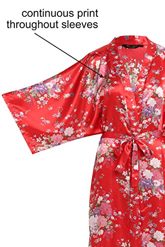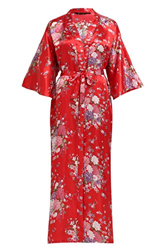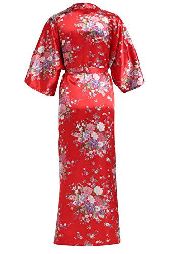 BABEYOND Womens Kimono Robe Long Floral Wedding Robes for Bridesmaids Satin Silk Kimono Nightgown Sleepwear 135cm Long (Red)