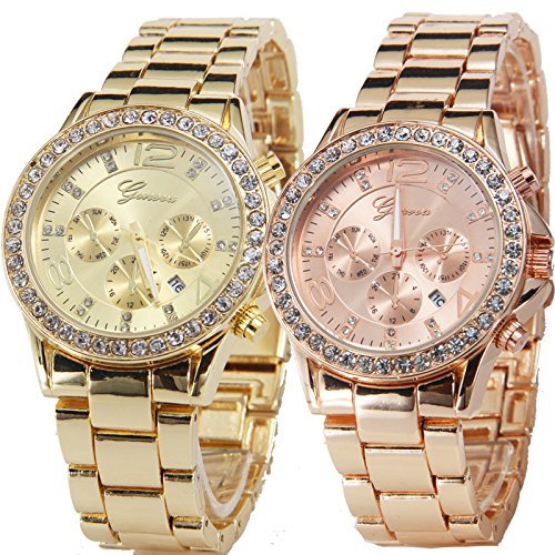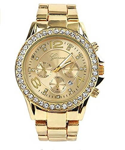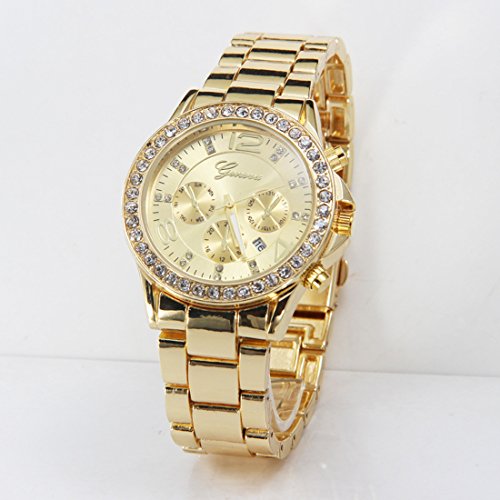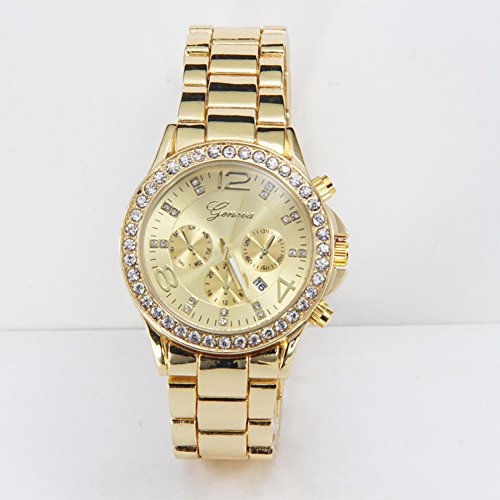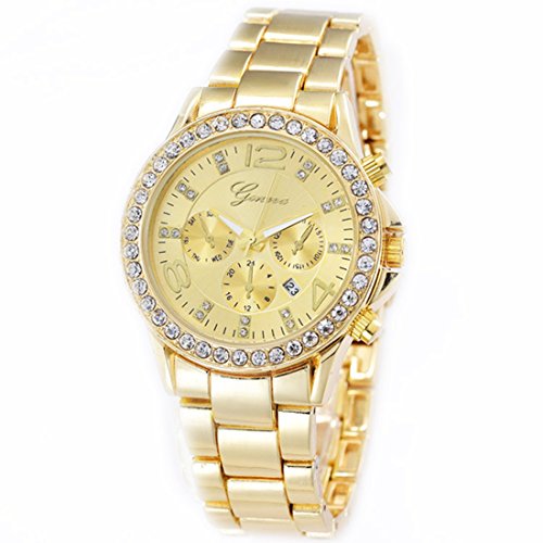 - BLING RHINESTONE - Whole watch body has bright gold color coating, and watch bezel is embedded by bling Rhinestone, looks very shinning and stylish, it is a good choice for cosplay or stage theatre.