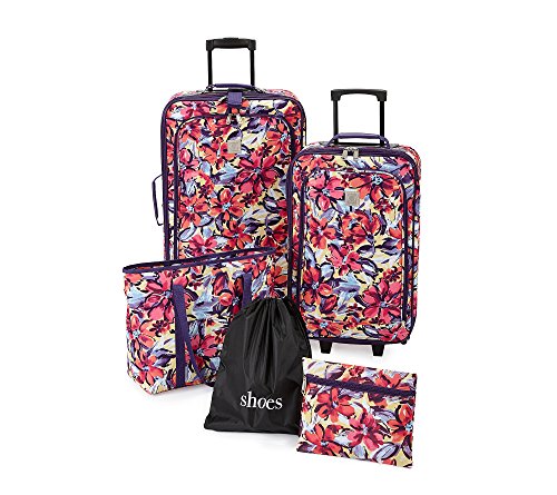 -. Brand : TravelQuarters -. Department : unisex-adult -. Feature : Nylon / Five piece luggage set / 24" upright: 24" x 15.5" x 8.5" / 20" upright: 20" x 13" x 7" / Travel tote: 18" x 6" x 13" -. ProductGroup : Apparel -. ProductTypeName : LUGGAGE -. Title : Travel Quarters Water Floral 5-Pc. Luggage Set