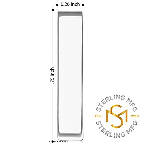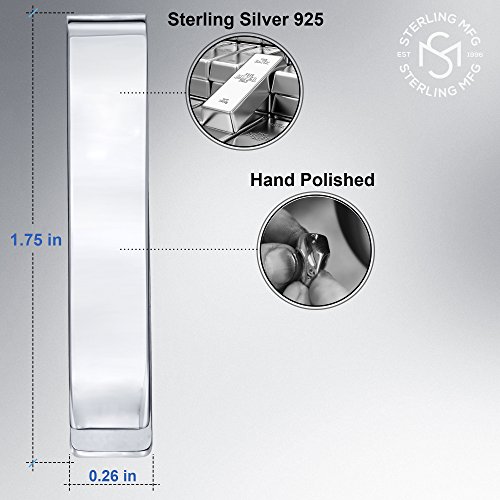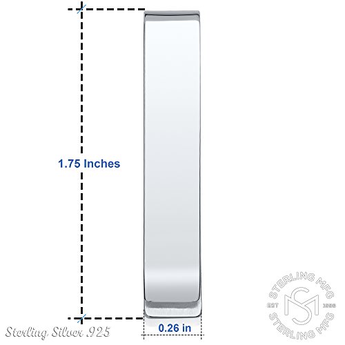 Studio : Sterling Manufacturers Publisher : Sterling Manufacturers Binding : Jewelry Product Description Sterling Silver .925 Money Clip, Made in Italy, Hand Polished, Elegant Solid Design, Engravable. Weight is approx 8.2 grams and measurements are approx 1 3/4 " by 1/4". CARING FOR STERLING SILVER As with all sterling silver, never use anything but a clean 100% cotton or a special sterling silver cleaning cloth. Paper, polyester, and coarse fabrics often contain wood fibers or synthetics that can cause tiny scratches in the surface of your fine sterling silver jewelry. Remember, silver is a very soft metal and you can scratch it if you aren't careful so don't rub it too briskly. Silver should not come into contact with harsh household chemicals such as bleach, ammonia, or chlorine. To avoid silver from tarnishing, store silver jewelry in a velvet lined jewelry box or pouch, as it is prone to tarnish as it naturally reacts with sulfur or hydrogen sulfide in the air. CARING FOR RHODIUM PLATED (PLATINUM PLATED), GOLD PLATED, ROSE GOLD PLATED OR BLACK RHODIUM PLATED SILVER As with all plated items, it is extremely important to keep them away from any kind of chemical. Do not clean them in the dishwasher or use ultrasonic cleaners that utilize chemicals. Never use toothpaste and never brush with a toothbrush. Do not use polishing cloths that are intended for use on uncoated silver or for gold jewelry, and ensure pieces are not in regular contact with hard surfaces. Avoid contact with perfume, hairspray, body lotion, body wash, soap, and household cleaning products. Clean plated silver with warm water and a mild liquid soap. Rinse thoroughly and dry with a soft polishing cloth immediately to avoid mineral residue from the water. Do not swim in the ocean with plated jewelry. Plating may wear off over time. Re-plating jewelry does not take long, and most professional jewelers offer this service. Keep plated jewelry in a velvet-lined jewelry box, or wrap it in a soft material that will prevent scratches. 0