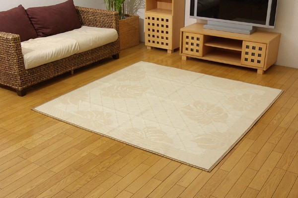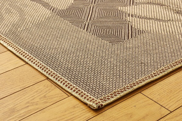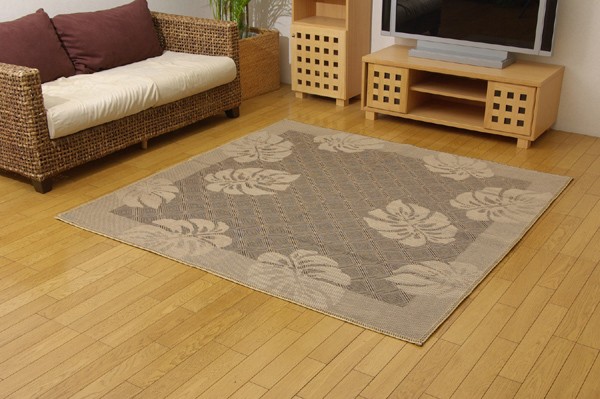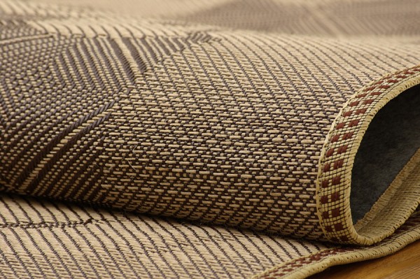 麻糸とポリエチレン糸のジャガード織りのカーペットです。横糸には麻糸を使用しています。熱伝導率に優れ、通気性が良く、夏ものの衣料や寝装具などに用いられることの多い素材です。また適度な光沢があり、強度に優れているのが特徴です。裏にはフローリングを傷つけにくいよう不織布を貼っています。