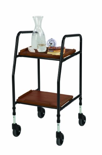 Use as a serving tray, utility cart or portable table; 2 dark oak wood trays w/raised edges. smooth-rolling wheels for use in most household/institutional surfaces. frame made of durable black steel and 3” caster swivel wheels. adjustable height from 30-1/2”– 35-1/2”; tray size: 15-3/4” x 11-3/4”; overall size: 17” x 18-1/2” x 35-1/2”; weight: 21 lbs.; weight capacity: 250 lbs.Feature