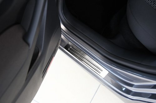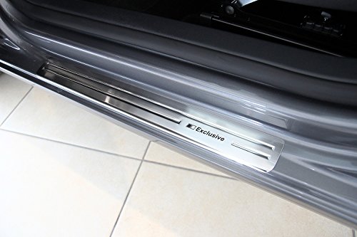 -. Feature : Passend für VW GOLF VI 5-türer / Komplett aus V2A Edelstahl mit in die Längsrichtung fein gebürsteter Oberfläche / Abkantung und Hochglanzprägung (Rillen) nach Innen. / 4-teiliges Edelstahl Einstiegsleisten Set für alle Türen / Exclusive Schriftzüge auf beiden vorderen Einstiegsleisten