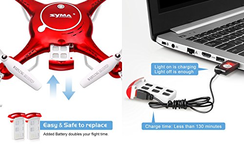 Item: X5UW UNIQUE BATTERY DESIGN : Easy to replace HD Wifi Real Time Transmission: 1MP(picture) 720p (video) Frequency: 2.4Ghz Acessories: one 4GB Card and one card reader Color: Red Charging time: About 130 minutes Flying time: about 5-10 minutes Controlling distance: About 50-100 meters Battery: 3.7v 500mah Li-ion (included) Product size: 32 x 32 x7 cm