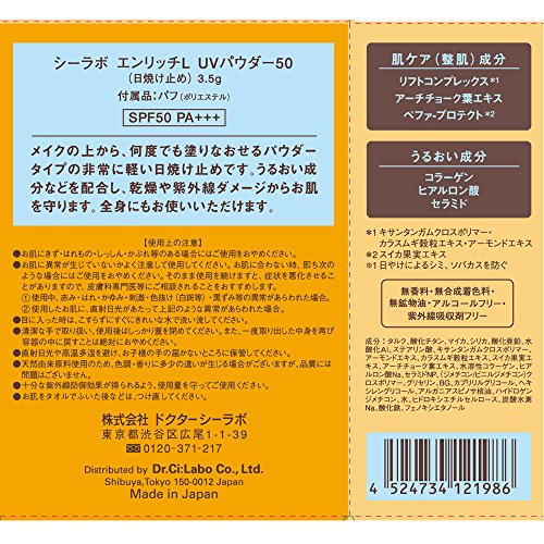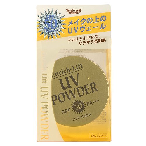 Dr. Ci:Labo Enrich-Lift UV Powder SPF50 / PA+++Powder type Sunscreen to make it possible to reapply on your make-up and overcome the weakness of old-type sunscreen.Formulated with beauty compounds attract Enrich generation.DNA's protection against UV light.Beautiful & smooth skin is good match with foundation!Feature