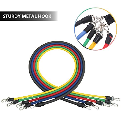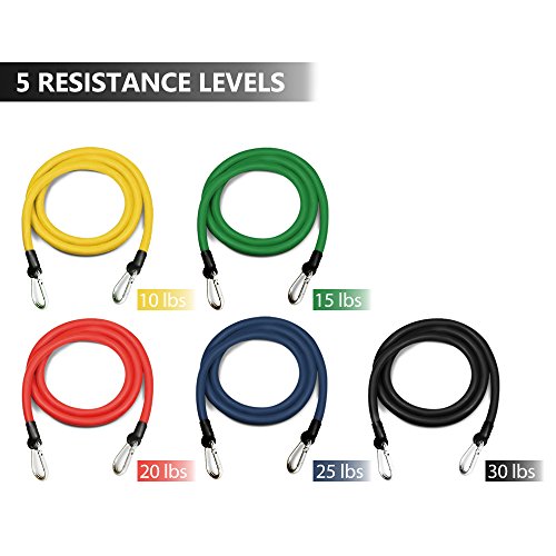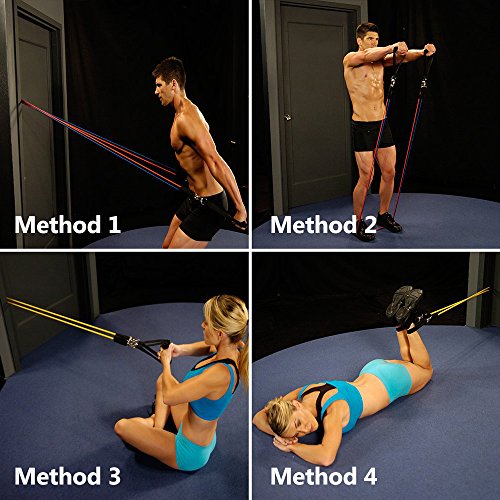 MULTIPLE COMBINATIONS & USE :5 levels of elastic bands,Yellow (10 lbs), Blue (25 lbs), Green (15 lbs), Black (30 lbs) and Red (20 lbs.).You can freely combine them to meet you different requirements.All bands are 45 inches in length.It enable the user to add or subtract resistance to create the perfect challenge for every muscle group. Combine all of the bands in this set to create up to 100 lbs!