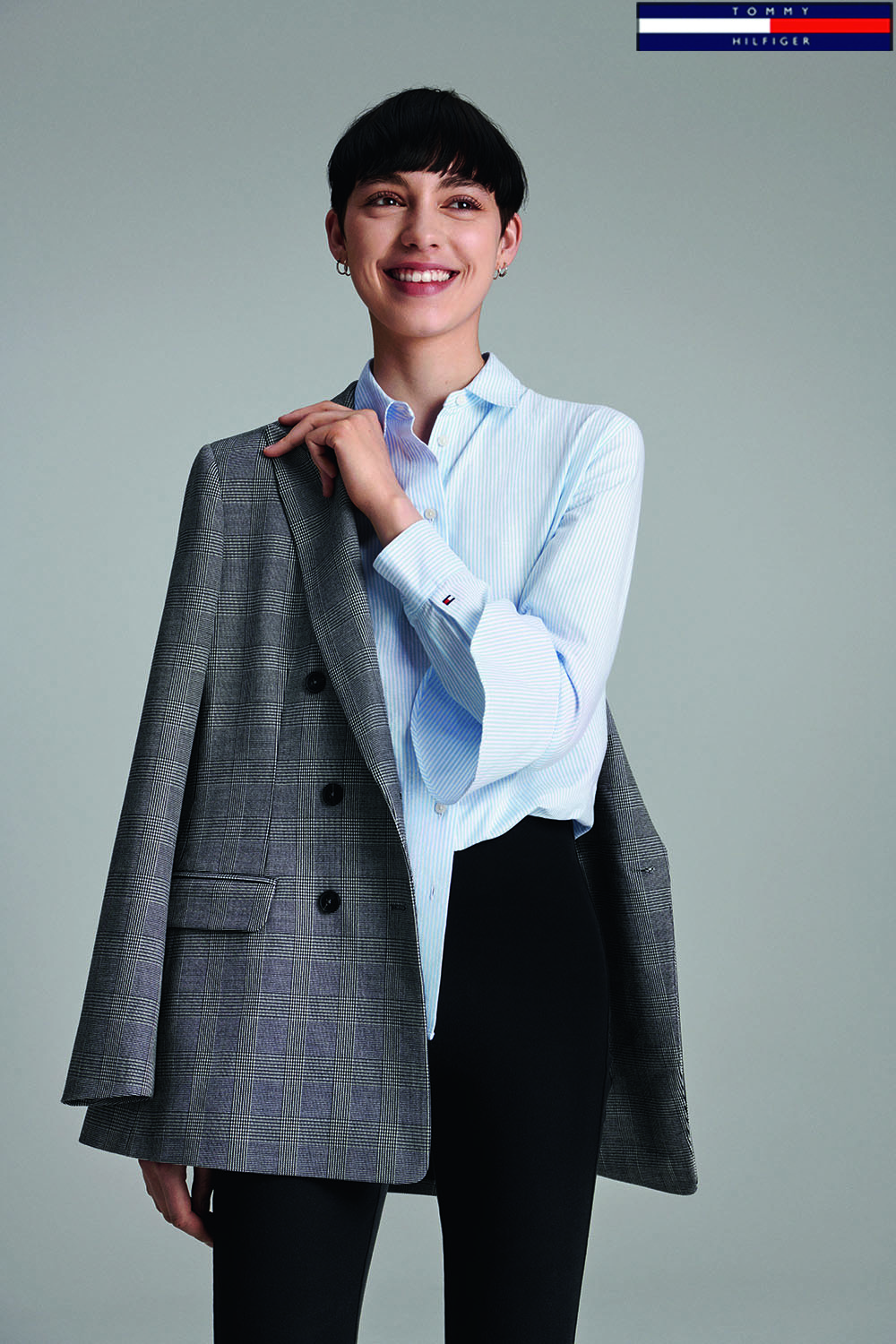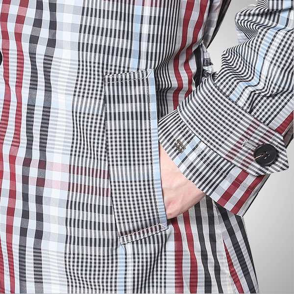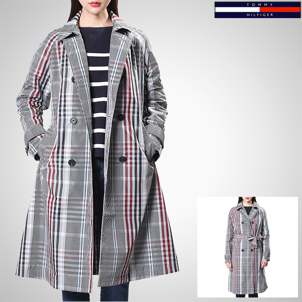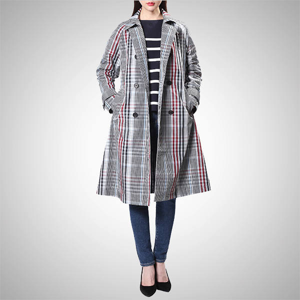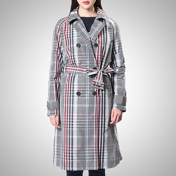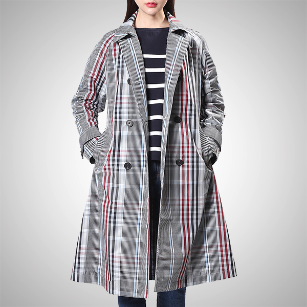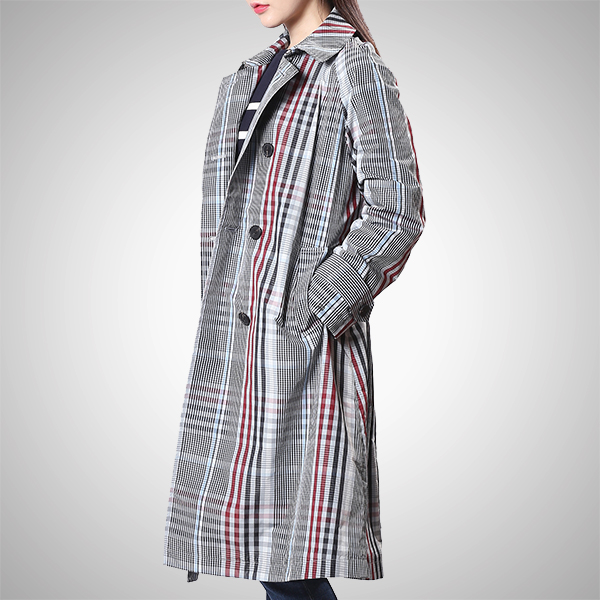 전면 체크 패턴이 돋보이는 벨티드 롱 코트입니다.