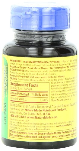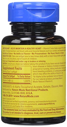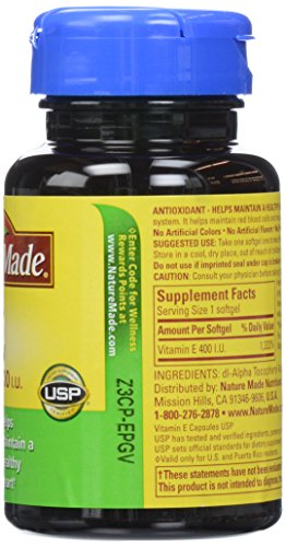 -. Binding : Health and Beauty -. Brand : Nature Made -. Color : Parent -. IsAdultProduct : 0 -. Label : Nature Made -. Manufacturer : Nature Made -. PackageQuantity : 1 -. ProductGroup : Health and Beauty -. ProductTypeName : HEALTH_PERSONAL_CARE -. Publisher : Nature Made -. Studio : Nature Made -. Title : Nature Made Vitamin E 400IU, 100 Softgels (Pack of 3)