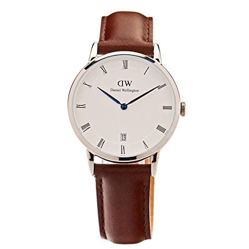 Stainless steel case with a brown leather strap. Fixed stainless steel bezel. Eggshell white dial with blue hands and Roman numeral hour markers. Dial Type: Analog. Quartz movement. Scratch resistant mineral crystal. Pull / push crown. Solid case back. Case size: 34 mm. Case thickness: 7 mm. Round case shape. Band width: 17 mm. Water resistant at 30 meters / 100 feet. Functions: date, hour, minute. Casual watch style. Daniel Wellington Dapper Bristol White Dial Mens Watch DW00100098.Feature