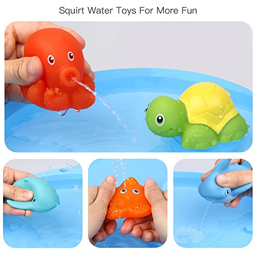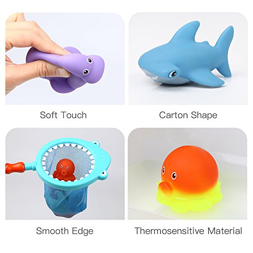 -. Feature : SOFT BATH SQUIRT TOYS SET - 7pc/pack includes shark style spoon-net, dolphin, starfish, shark, tortoise, octopus, walrus. Colorful and cute water toys encourage baby's visual development. / THERMOSENSITIVE SQUIRT WATER TOYS - The octopus and starfish are very special and amazing, will automatically change the color from organge to yellow over 38℃ water. And also the squirting toys provide funny and relaxing bathe environment for babies. / EASY FOR LITTLE HANDS TO GRASP - Compact size perfectly fits little hands, kids can easily squeeze or hold, helps develop their hand-eye coordination. The animal pool toys can float on the water just like swimming, bring more joy during bathe. They can also take them as outdoor water activity. / 100% BPA-FREE SKIN-FRIENDLY TUB TOYS - Non-toxic plastic is nice for toddlers. With smooth edge, cannot hurt baby's delicate skin, ensures newborn playing safely. / DEVELOP INTELLIGENCE AND MOTOR SKILLS - Help kids learning to identify animal names and sounds besides bath entertainment. Really good children' s early education toy! Best choice for toddlers as birthday present. Recommended for 6 months and up.