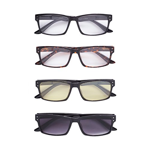Studio : Inner Vision Publisher : Inner Vision Binding : Health and Beauty Product Description Standard fitting rectangle shape reading glasses are perfect for anywhere - bedroom, office, bathroom, or any area of the house you read in! UV protection sunglasses let you read outside, enjoying the sun and your favorite book at the same time. Computer and gaming yellow-tint glasses are perfect for the office or home to help reduce eye strain fatigue caused by exposure to television, laptop, tablet, phone or computer screens. Neutral colors and shape look good on most face types. Choose your magnification and don't worry about getting a great fit with the comfort and durability of spring hinges. Affordable low price gives you peace of mind in case you lose them between the couch cushions. Value 4 pack means you will always have a backup pair! 0