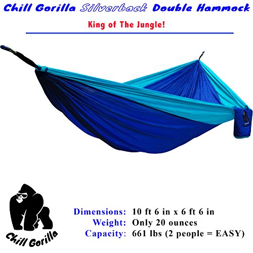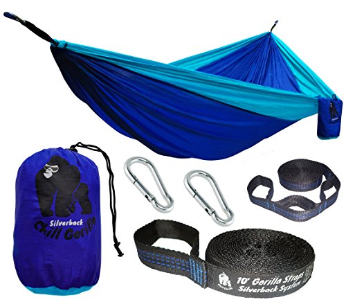 ✔ VERSATILE AND INDESTRUCTIBLY BUILT - OUR HAMMOCKS EVEN HAVE WEB STRAPS FOR THE HAMMOCK ENDS! Chill Gorilla gear is practical, reliable, lightweight and durable. Whether you are setting up between two trees, around rocks or have some other crazy anchor points you can rest in comfort knowing our gear will support you. Every Chill Gorilla Silverback hammock comes with 2 - 10' hammock straps with 30 total adjustment loops, 2 strong carabiners, and a gear sack to keep your gear organized.