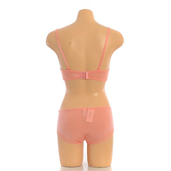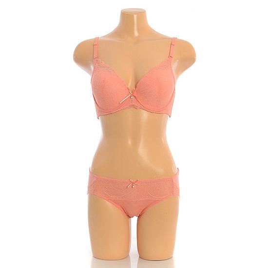 잔잔한 무늬의 가볍고 섬세한 레이스로 여성스러운 느낌과 3/4컵 라인으로 편안하게 가슴 라인을 모아주는 브래지어 레이스팬티 세트입니다.봄 여름 시즌에 사랑스럽게 연출 가능한 민트와 톡톡튀는 코랄오렌지 컬러로 구성되었습니다.