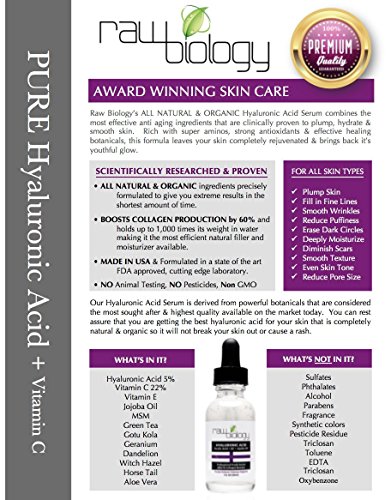 -. Feature : 1 OZ Recommended PUREST Hyaluronic Acid on the market. ALL NATURAL & 72% ORGANIC / 100% GUARANTEED RESULTS. Moisturize, correct, prevent skin damage to face, eyes, neck & chest. / SCIENTIFICALLY RESEARCHED & PROVEN to: ++Plump Skin ++Fill in Fine Lines ++Prevent Wrinkles ++Reduce Puffiness ++Erase Dark Circles ++Permeate Dermis to Stimulate Collagen ++Diminish Scars ++Hydrate & Nourish / Dermatologist recommended ingredients included in this cutting edge formula: Vitamin C&E, Botanical Hyaluronic Acid, MSM, Jojoba Oil, Green Tea, Essential Amino Acids & Antioxidants. / NATURAL & ORGANIC ingredients. NO HARMFUL CHEMICALS & CRUELTY FREE testing.