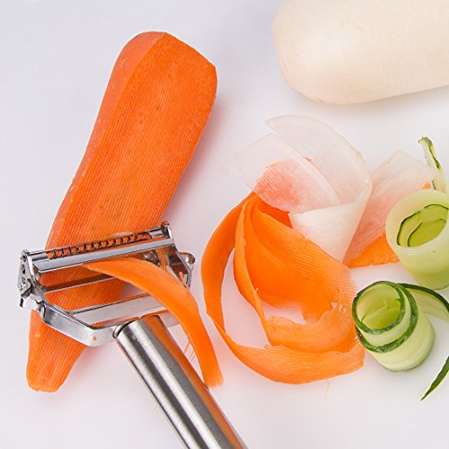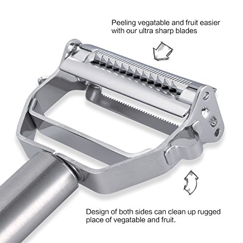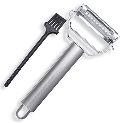 Multi-Functional peeler with cleaning brush; It is a great choice as a gift. Double-sided blade: one side for peeler and the other for slicer