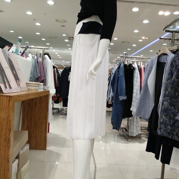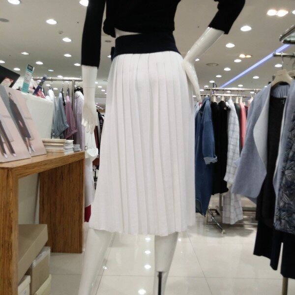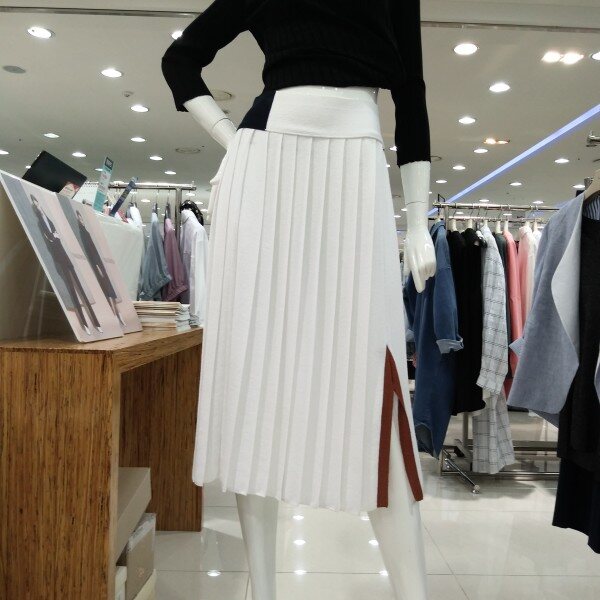 린네소재가 혼방된 니트스커트로 차분한 이미지 연출가능 ㆍ허리와 치마 끝단 옆선에 배색 포인트로세련된 느낌 ㆍ 치마의 전체길이는 77cm의 롱치마