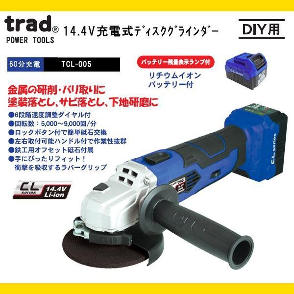 人気のDIY工具!バッテリーがシリーズ共通で使える!金属の研削、バリ取りに。塗装落とし、サビ落とし、下地研磨に。 製造国:中国 素材・材質:樹脂 ※サプライヤー直送品 ご注文後3~4営業日後の出荷となります【商品名】TRAD 14.4V 充電式ディスクグラインダー TCL-005