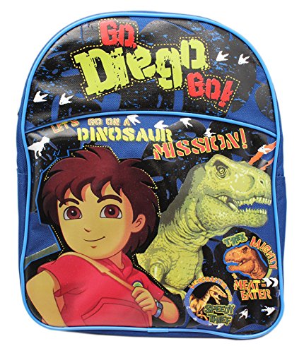 -. Brand : Go Diego Go! -. ClothingSize : Small -. Color : blue -. Department : boys -. EAN : 8909256852949 -. Feature : Go Diego Go! Backpack / Small size backpack / Single compartment, not meant for older kids / Should be used by young children and toddlers to carry small school supplies and a lunch / Measures 12in (30.5cm) tall and 10in (25.5cm) wide -. ProductGroup : Apparel -. ProductTypeName : LAGE -. Size : Small -. Title : Go Diego Go! Dinosaur Mission Small Size Kids Backpack (12in)