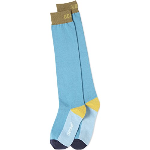 -. Binding : Apparel -. Brand : Life is Good -. Department : womens -. Feature : One size fits all / Messaging under cuff / The Life is good company donates 10% of all sales to kids in need / Cotton/Nylon/Spandex -. Label : The Life is good Company -. Manufacturer : The Life is good Company -. ProductGroup : Sports -. ProductTypeName : OUTDOOR_RECREATION_PRODUCT -. Publisher : The Life is good Company -. Studio : The Life is good Company -. Title : Life is Good Women's Good Vibes Color Block Knee Socks