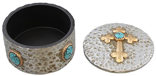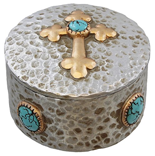 Rustic Hammered Silver & Copper Look Cross Trinket Box w/ Faux Turquoise Accents