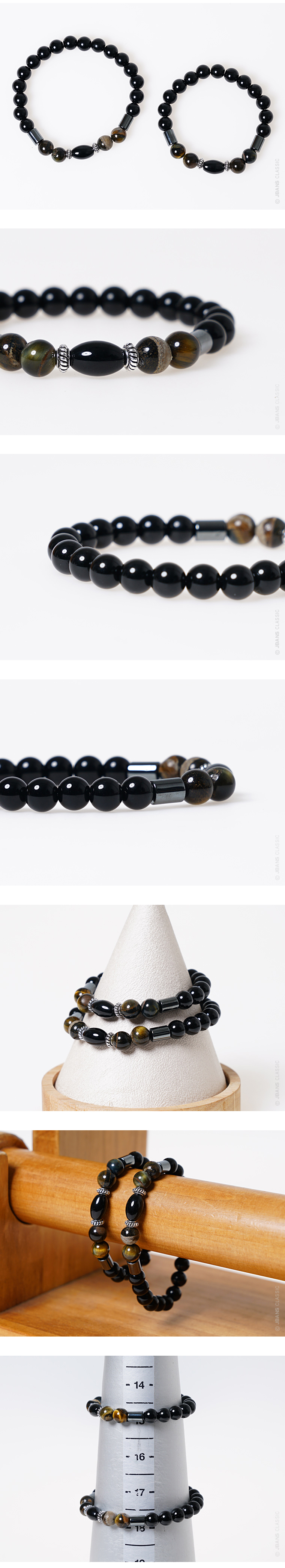 블랙톤 원석둘과 실린더타입 해마타이트를 이용해 제작된 원석팔찌입니다. 유광 오닉스를 기본으로 은은한 실린더타입 헤마타이트와 컬러감이 매력적인 청호안석을 잘 매치해 누구나 부담없이 착용 가능한 디자인의 팔찌로 제작되었습니다. 앤틱한 느낌의 은장식은 과하지 않은 포인트로 그 매력을 더해줍니다. 가죽팔찌 등 다른 악세사리와 함께 레이어드하면 더욱 잘 어울립니다. 커플팔찌로 착용하기 좋도록 남성용, 여성용, 주문제작 사이즈로 제작됩니다.