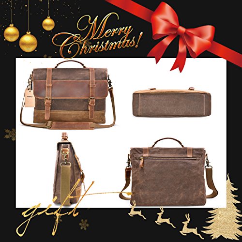 -. Feature : Premium Material Waterproof Construction - Made of superior cowhide crazy horse leather and heavyish water-resistant waxed canvas to ensure the use of long-term.The cowhide leather comes with a wrinkles and scratches appearance.Handmade series transforms the original natural beauty into every messenger bag. / Plenty of Space & Padded Laptop Sleeve - The laptop bag is a decent large size that fits 15''MacBook Pro.Main compartment with zipper closure outside;The inside consist of a couple different dividers,a 15''laptop can easily fit inside and a built in divider between the inside compartments to help separate them all.1 zipper pocket inside for significant articles such as wallets and identification documents,2 inner slip pockets,1 back slot is perfect for an iPadmini. / Wide Strap & Magnetic Button- This satchel could also be a professional briefcase after detaching this strap.Adjustable and detachable strap makes it easy to handle and carry. / External Dimensions: 15"(L)x11"(H) x 4.33"(W),Laptop pocket: 15'' (L)x10.6(H)'',Shoulder Strap adjusts:31.4"- 55'',,Strap Width: 1.37'',Weight: 2.73 pounds. / Incredibly Stylish - Sturdy enough to stand on its own,looks high end with formal or casual attire. Perfect for students, business or travelers want to make a fashion statement.