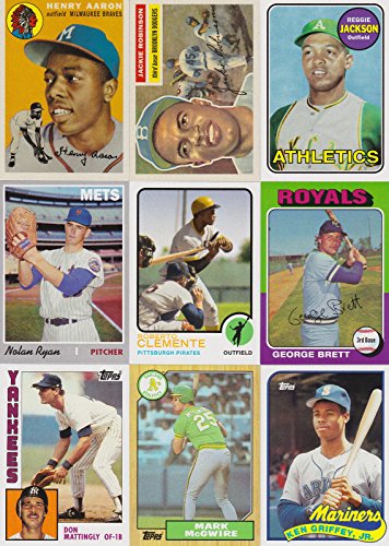This is the 2017 Rediscover Topps Baseball Promo 10 card insert set highlighting the classic rookie cards of Hank Aaron, Jackie Robinson, Reggie Jackson, Nolan Ryan, Roberto Clemente, George Brett, Don Mattingly, Mark McGwire, Ken Griffey Jr. and Mike Trout.