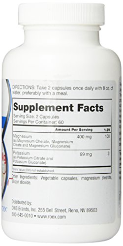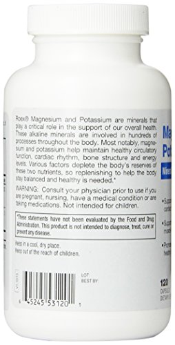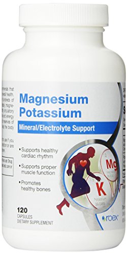 -. Binding : Health and Beauty -. Brand : Roex -. EAN : 0645245531201 -. Feature : Both minerals have been shown to be beneficial in maintaining a healthy neurological system and regular heart rhythm / Supplementing with magnesium and potassium may have a beneficial effect on energy levels and athletic stamina / Oral ingestion of magnesium in combination with potassium has been reported to improve symp of fatigue and lack of energy -. IsAdultProduct : 0 -. Label : Roex -. Manufacturer : Roex -. NumberOfItems : 1 -. PackageQuantity : 1 -. ProductGroup : Health and Beauty -. ProductTypeName : HEALTH_PERSONAL_CARE -. PublicationDate : 2012-12-22 -. Publisher : Roex -. ReleaseDate : 2013-01-01 -. Studio : Roex -. Title : Roex Magnesium Potassium Dietary Supplements, 120 Count -. UPC : 645245531201