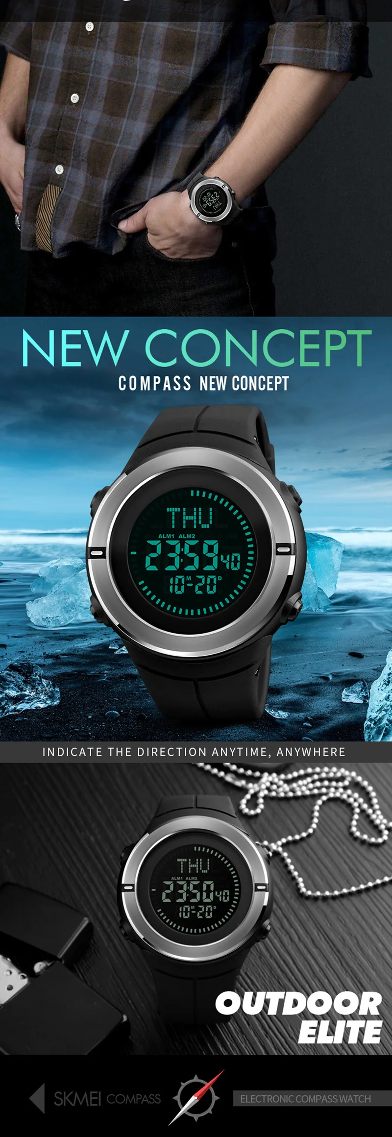 Feature:Back Light,Alarm,Water Resistant,Stop Watch,Complete Calendar,Week Display,Compass